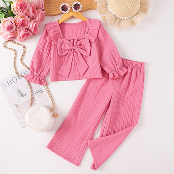 Catpapa Local Warehouse Girls' Casual Worsted 2-Piece Clothing Set Pink Lace Square Neck Long Sleeve Top Bow Long Pants Autumn