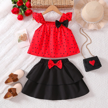 Catpapa Local Warehouse Girls' Casual Two-Piece Skirt Clothing Set with Flutter Sleeve Top and Bow Tie Patchwork Black Skirt