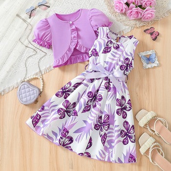 Catpapa Local Warehouse Girls' Casual Summer Dress Set Purple Small Jacket Floral Pattern Sashes Children's Clothing Set