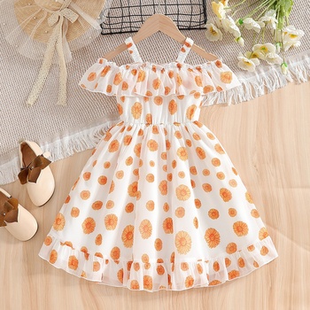 Catpapa Local Warehouse Girls' Summer Strap Sweet A-Line Dress Orange Floral Pattern Ruffle Children's Princess Dress