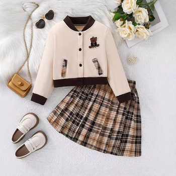 Catpapa Local Warehouse Girls' Autumn Winter Casual Baseball Jacket & Plaid Skirt with Bear Embroidery Children's 2-Piece Set