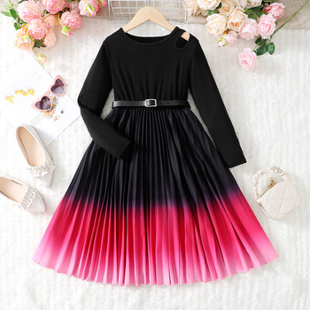 Herfst Elegantie Gradiënt Print Meisjes Jurk Odm Groothandel Ronde Hals Lange Mouw Voor Kinderen
